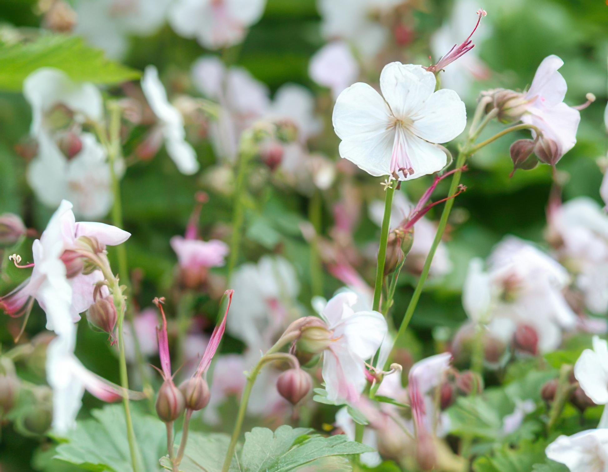Die **Geranium cantabrigiense 'Biokovo'** ist ein niedrig wachsender Bodendecker (10-15 cm), der im Mai und Juni zarte weiß-rosa Blüten trägt.