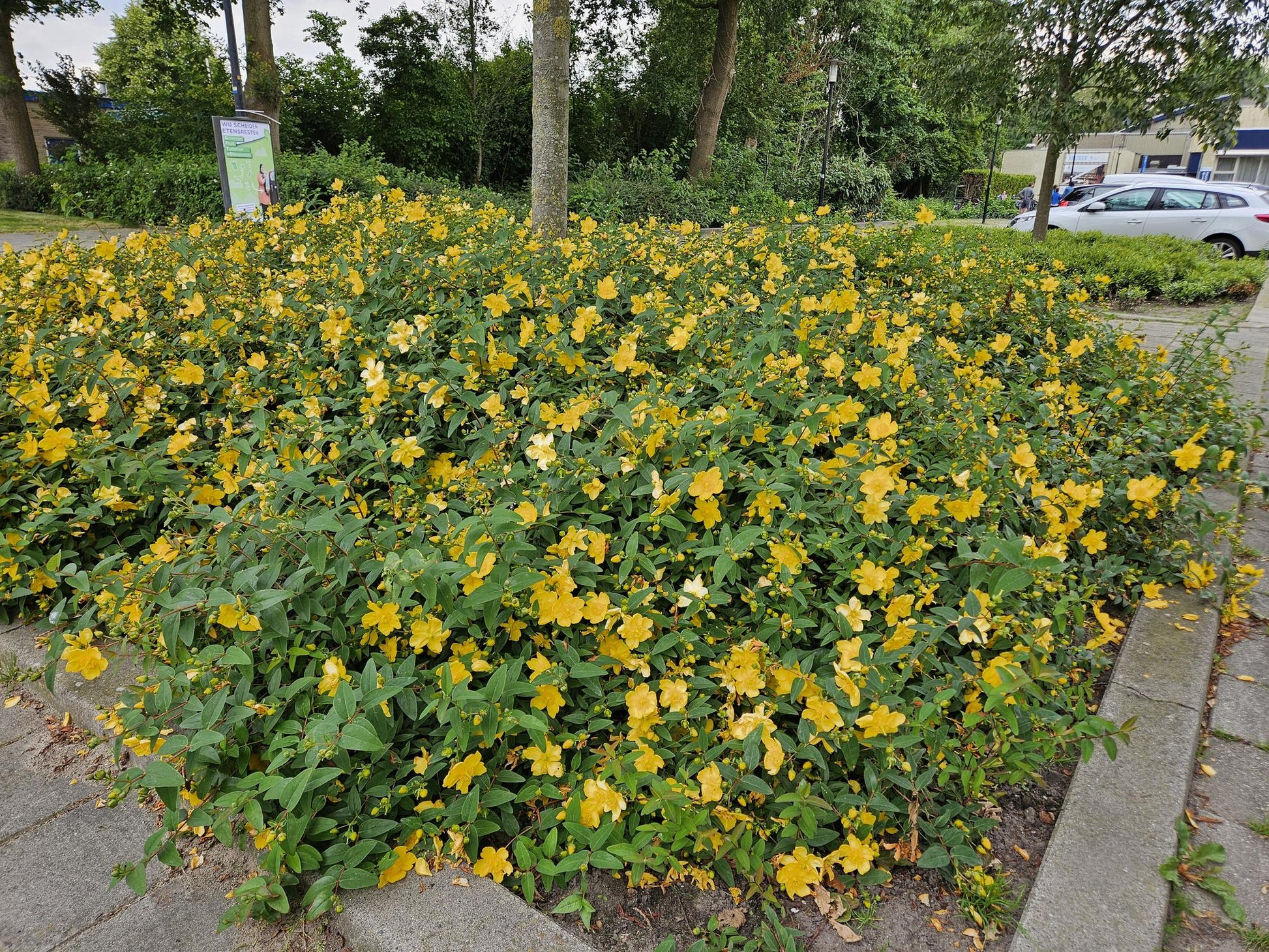 Diese robuste, immergrüne Pflanze hat glänzendes, tiefgrünes Laub und produziert von Mitte Sommer bis spät in den Herbst große, leuchtend gelbe Blüten mit auffälligen, sternförmigen Staubgefäßen. Die Blüten ziehen Bienen und Schmetterlinge an und fördern so die Biodiversität im Garten.
