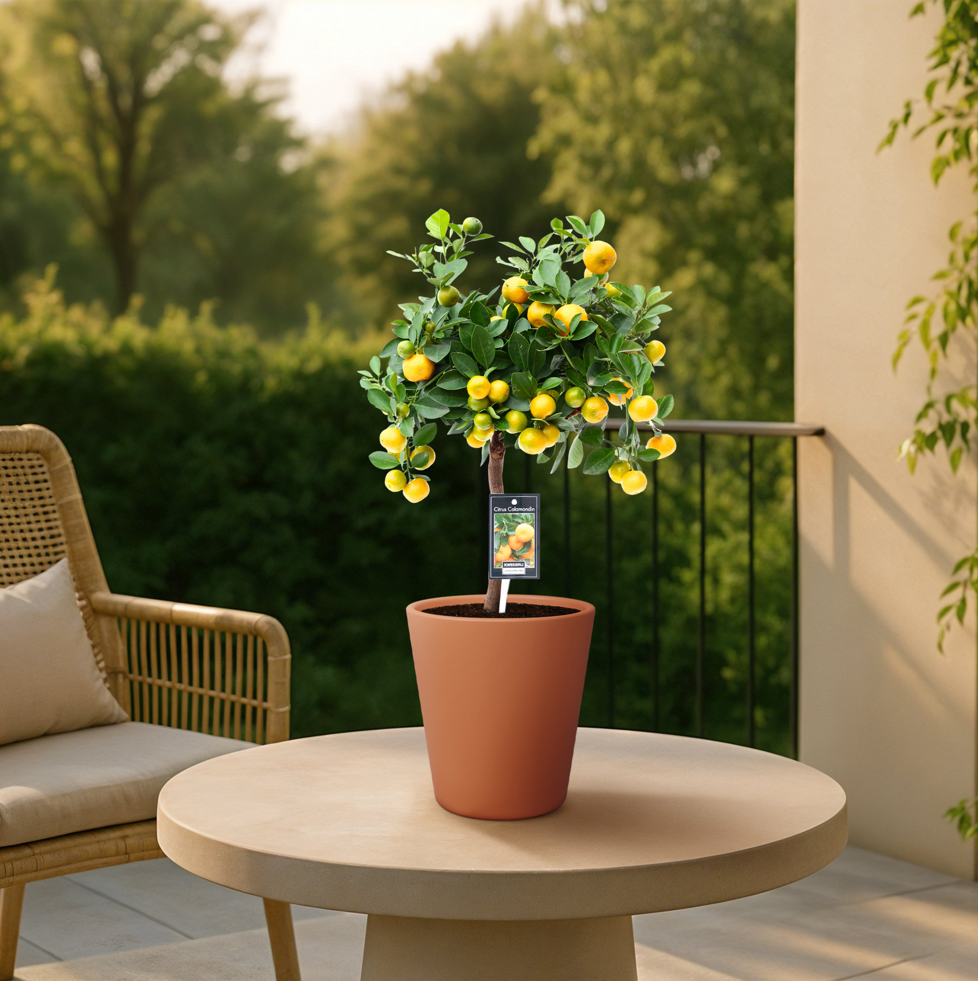 • Die Citrus Calamondin ist eine kompakte Zitruspflanze mit glänzenden, dunkelgrünen Blättern.
