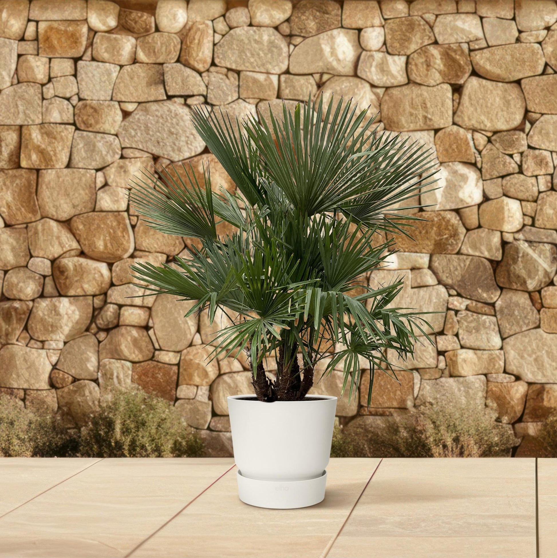 Aussehen der Pflanze: Die Trachycarpus hat große, fächerförmige Blätter, die grün sind und der Pflanze ein tropisches Aussehen verleihen. Die Pflanze hat einen stabilen Stamm, der mit Fasern bedeckt ist, was ihrem robusten Aussehen beiträgt. Diese Palme hat einen exotischen Charme und kann das auffällige Highlight in jedem Raum oder Garten sein.